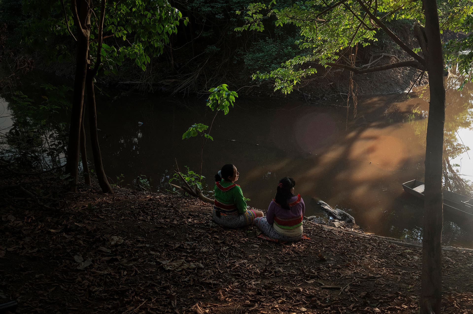 Judith y Cecilia, dos colegas y amigas, se sientan a orillas de una cocha a compartir sus logros y frustraciones en torno a su realidad como mujeres Indígenas.
